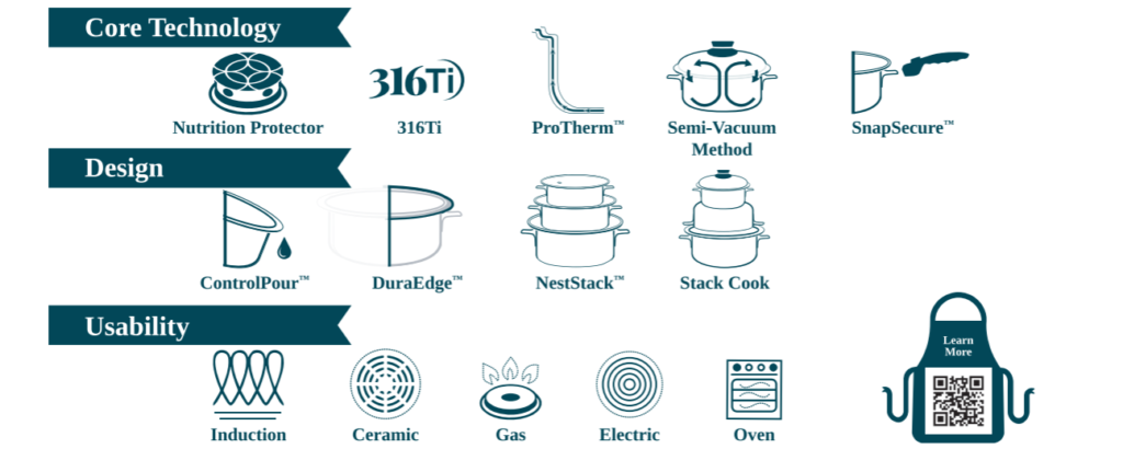 Våre kokekar er et vitenskapelig basert system som er utviklet for å maksimere smak, næringsinnhold og energi. Hvert element er spesialdesignet for å levere eksepsjonell ytelse. Denne synergien av funksjoner gjør matlaging til en sunnere og mer energieffektiv prosess.